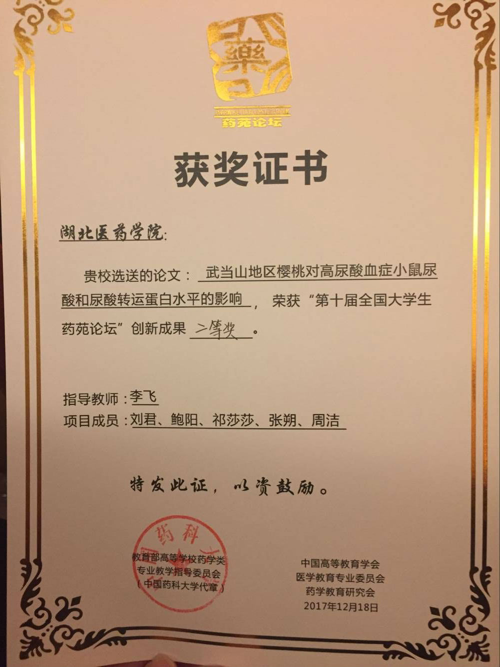 药学院历来重视学生创新能力培养并设立本科生科研训练计划。对此项活动学院予以了极高重视,选派学院副院长、优秀青年教师李飞担任指导教师。经过精心组织选拔,确定药学院2015级本科生刘君、祁莎莎、张朔,第一临床学院2016级本科生鲍阳,药学院2015级研究生周洁为项目组成员。李飞秉承“一做事情就认真”的态度,自9月开始,她和项目组成员忘我投入、精心准备,牺牲了“十一”假期和双休时间,加班加点,在壁报制作、论文撰写和PPT制作上字字斟酌,多次演练,不断修正。临行前,药学院领导观摩了最后一次演练并给予了指导。通过论文网上评审、学生成果展示、现场答辩、专家现场提问等环节的激烈角逐,最终荣获创新成果二等奖,充分展示了我校大学生的创新能力和科研水平。