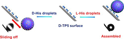 宏观液滴在界面上的自组装行为因其在传感材料和控释材料等领域的潜在应用价值,越来越引起研究者们重视。本文采取D-二苯甲酰化酒石酸功能化的柱[5]芳烃分子(D-TP5)修饰在界面,用来区别组氨酸的两种对映体液滴。首先,在分子水平确定了D-TP5对组氨酸具有手性选择性(KL / KD= 4.6);进一步利用点击反应将D-TP5修饰在硅界面,通过接触角、红外光谱及XPS等手段证明了界面的成功构建;D-TP5界面对L-组氨酸液滴表现出粘附现象,而D-组氨酸液滴则不能粘附在D-TP5界面。说明D-TP5界面对组氨酸对映体液滴具有宏观水平的识别作用。其识别机理可能是因为在分子水平D-TP5对L-组氨酸具有更好的识别作用,宏观表现为该识别过程的作用阻止了L-组氨酸液滴在D-TP5界面下滑的过程。该现象为揭示生命体中手性识别过程和生物界面上的手性自组装行为提供了新的思路。