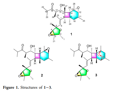 原文:Qin Li, Chunmei Chen, Yan He, Danyingzi Guan, Li Cheng, Xincai Hao, et al. EmerionesA−C: Three Highly Methylated Polyketides with Bicyclo[4.2.0] octene and3,6-Dioxabicyclo[3.1.0] hexane Functionalities from Emericella nidulans[J].Organic Letters, 2019, 21, 5091-5095 (郝新才)