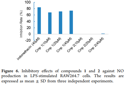 从构巢裸孢壳的次级代谢产物中发现三个具有双环[4.2.0]辛烯和3,6-二氧杂环[3.1.0]正己烷功能团高度甲基化的聚酮类新骨架化合物,EmerionesA−C(1-3)。其中,化合物EmerionesC中的过氧桥使其成为7,8-二氧杂环的癸烯骨架,为首次报道。此外,EmerionesA对脂多糖诱导的RAW264.7细胞有一定的抑制NO产生的作用。该研究对聚酮类化合物结构、生物活性方面的研究以及开发相关药物奠定了基础。