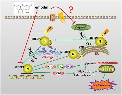图1 大黄素通过脂代谢关键转录因子SREBP1而抑制肝癌细胞脂代谢机制假说图。