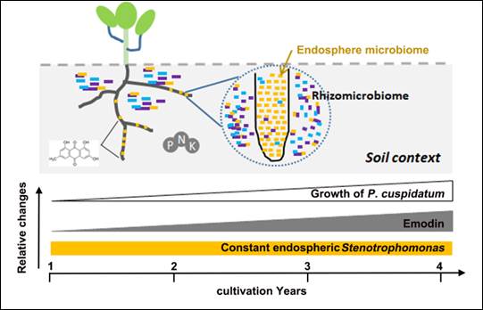 虎杖是十堰地区种植面积较大的中药材之一。虎杖不仅是传统的根用中药材,更是提取保健品白藜芦醇的首要工业用原材料。由于解剖结构和遗传背景复杂等因素,目前有关虎杖的药用植物学,尤其是分子生药学研究仍极为有限。该研究通过富集根际促生菌来提高生物活性物质在药用植物虎杖根中的累积水平。由于虎杖根是富集活性天然产物的主要器官,通过施用根际促生菌及栽培管理提高次生代谢物累积水平具有可行性。通过连续四年虎杖种植的土壤基本元素和根际微生物群落结构的监控和调研,分析了虎杖根主要次生代谢物累积水平与不同生长年份、土壤理化性质、根际微生物等的关联,率先发现虎杖根在不同土壤环境中,选择性富集促生菌Stenotrophomonas,且不随生长年份改变,并可促进大黄素在虎杖根的累积(图)。该研究为提高虎杖根中的药用活性成分的积累从根际微生物角度提供了新的证据和思路。