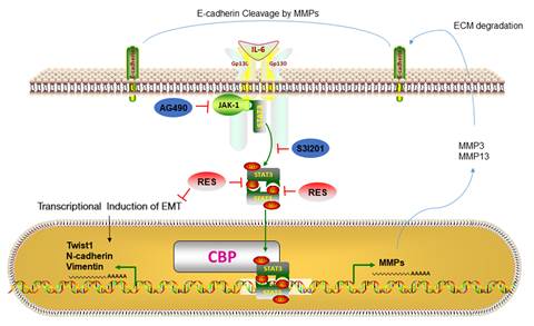 近日,该课题组联合武当特色中药研究湖北省重点实验室在CancerMedicine上发表了题为《ResveratrolSuppress the Growth and Metastatic Potential of Cervical Cancer through Inhibiting STAT3Tyr705 Phosphorylation》的研究论文,该研究受湖北省自然科学基金、武当特色中药研究湖北省重点实验室开放基金和湖北医药学院博士启动金等项目的资助。本文就白藜芦醇对宫颈癌的化学预防和治疗能力进行评估,并重点介绍其作用机制。通过体内外实验以及AutodockVina数学模型虚拟筛选出了白藜芦醇的相互作用靶标STAT3蛋白,并通过实验证实白藜芦醇可以通过影响STAT3 Tyr705位点的磷酸化而不是Ser727位点来抑制宫颈癌细胞的增殖和转移潜能(分子机制如图1所示)。该文揭示了白藜芦醇可通过STAT3信号通路发挥预防宫颈癌的作用。