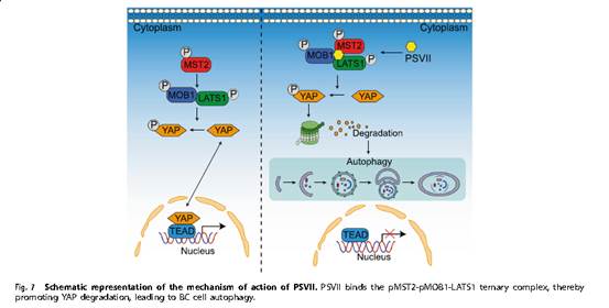 失调的Hippo通路与许多癌症恶性进展相关,从而使该通路成为癌症治疗的潜在靶标。该研究团队发现一种新的延龄草提取物paris saponin VII (PSVII)可以作为Hippo通路的直接激活剂而抑制乳腺癌的生长。 PSVII能够抑制多个乳腺癌细胞增殖,并诱导caspase依赖性的外部凋亡。 PSVII促进了乳腺癌细胞的自噬(包括自噬体的积累,LC3-II转化),并促进了自噬通量。 Hippo信号下游转录效应子Yes相关蛋白(YAP)的核易位参与了PSVII诱导的自噬。过表达YAP能够拮抗PSVII诱导的自噬。进一步的实验表明,PSVII诱导的YAP下调介导的自噬机制与YAP上游效应物LATS1活性形式的增加有关,即PSVII能够通过激活LATS1而下调YAP。LATS1的激活是多个蛋白质(包括MST2,MOB1和LATS1本身)参与的过程,并且依赖于MST2的顺序级联激活。进一步的实验表明,PSVII促进了BC细胞中LATS1与MST2和MOB1的结合。随后的分子对接模拟发现PSVII直接与MST2-MOB1-LATS1三元复合物结合。微型热泳动实验和基于靶点稳定性的药物亲和实验进一步证实了PSVII和MST2-MOB1-LATS1三元复合物之间的高亲和力。最后,PSVII在异种移植乳腺肿瘤中具有抑制肿瘤生长的能力,并在大鼠中具有良好的药代动力学。总之,该研究团队首次发现PSVII是一种新型的Hippo信号激活剂剂,并有望应用于乳腺癌治疗。