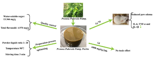 但神仙豆腐在加工过程中存在重要缺陷,影响了它的保鲜和外销,而只能“藏在深山无人识”,也影响了武当山百姓依靠青山绿水致富的脚步。神仙豆腐的传统凝固剂是草木灰,成分复杂,凝固时间一般长达半小时以上甚至需过夜,并且鲜叶不容易保存,无法保证跨季节食用以及长途运输保藏;而现代工艺尚未成熟,用碳酸钙做凝固剂则要么低浓度时凝固时间长,要么高浓度时渗水率(即脱水缩合)大,影响果胶外观、口感和质量。因此,发明一种既能速效凝固,又避免渗水率大的凝固剂成为当务之急。汪选斌教授团队该项发明解决了产业关键问题,彻底改善其因凝固剂局限性而无法远销问题,使之变为销往全国乃至出口的绿色食品,以扩大生产规模,并在此基础上将产品升级为保健食品,进一步提高产品附加值。该药食两用食品可即食即用;与此同时,还研究了其抗氧化、辅助抗炎等保健功能和安全性评价、关键生产工艺参数和剂型、制定生产质量控制标准。该项目已发表相关论文:李洪亮, 刘凯琪, 陈晓静, et al., UPLC-Q-TOF/MS/MS法分析长柄臭黄荆醇提物化学成分. 湖北医药学院学报, 2022. 41(04): 327-332.;LIU, K, GUO, Y, CHEN, X,et al., Quality control, preparation process optimizing and anti-inflammatoryeffects of Premna Puberula Pamp. Pectin. Heliyon, 2022. 8(10): e11082。该项目受国家自然科学基金(81874356;82274155)、湖北省卫健委中医药重点项目(ZY2021Z010);湖北省卫健委面上项目(WJ2021M055);武当特色中药研究湖北省重点实验室开放课题(WDCM2018002、WDCM2018002、WDCM2019017、WDCM2019018);“十四五”湖北省高等学校优势特色学科群(现代医学)项目(2022XKQY3)资助。