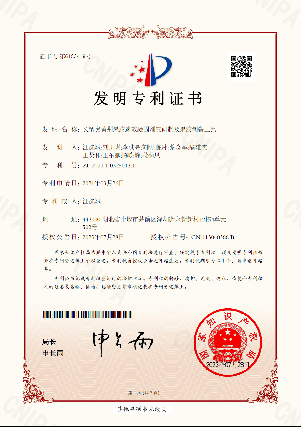 2023年7月28日,国家专利局通知,武当特色中药研究湖北省重点实验室汪选斌教授团队的发明“长柄臭黄荆果胶速效凝固剂的研制及果胶制备工艺”获国家发明专利授权(CN113040388B)。发明人为:汪选斌,刘凯琪,李洪亮,刘明,陈萍,蔡晓军,喻雄杰,王贤和,王东鹏,陈晓静,段菊凤。