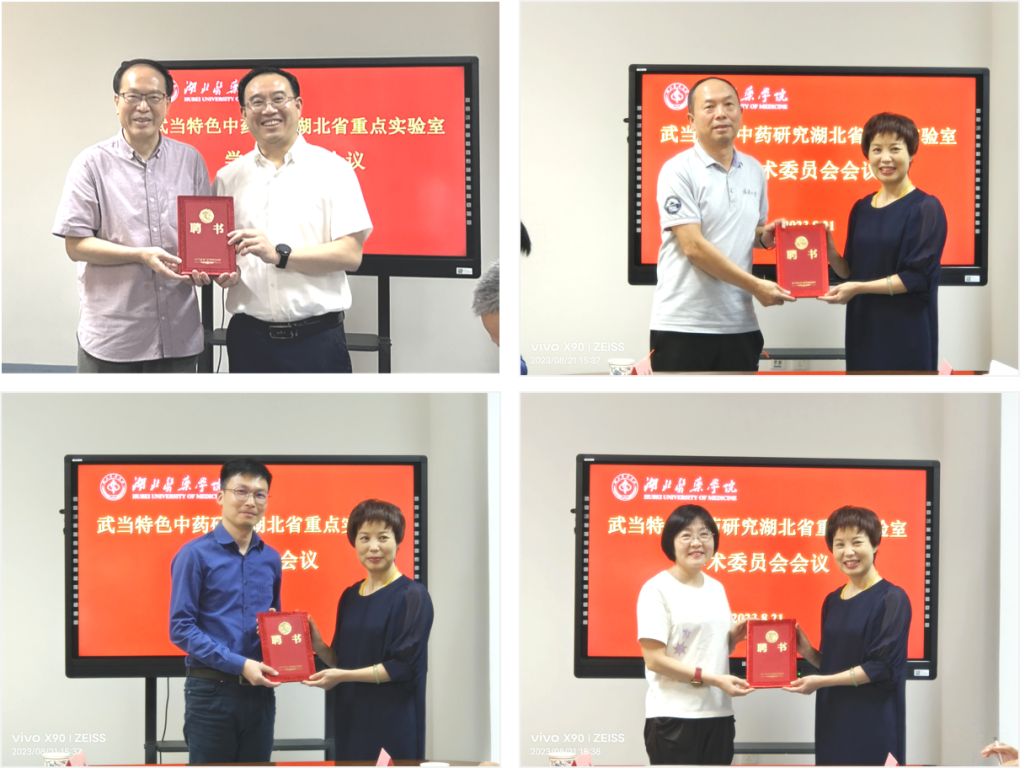 湖北医药学院副校长严世荣为华中科技大学陈建国教授颁发实验室主任聘书  | | 湖北医药学院副校长严世荣为上海中医药大学徐宏喜教授颁发实验室常务副主任聘书 |  | 湖北医药学院副校长严世荣为学术委员会副主任汪选斌教授颁发聘书   | 湖北医药学院校长王云甫、副校长严世荣为学术委员冯奕斌教授等专家颁发聘书 武当特色中药研究湖北省重点实验室(湖北医药学院)主任汪选斌教授介绍了实验室基本概况、研究成果及学术水平、队伍建设与人才培养、开放交流与运行管理、公共服务等,对过去一年的成绩与不足和十四五期间的工作思路进行了汇报。  | 武当特色中药研究湖北省重点实验室(湖北医药学院)主任汪选斌教授作工作汇报 与会专家对实验室连续六年省科技厅考核优秀的成绩表示肯定。专家肯定成绩的同时,还指出了今后工作重点实验室应在武当道地药材、十大楚药上下功夫,注重发展地域特色、武当特色,开发特色产品,建立中药教研机构、开发武当中药标本馆、收集中药材图集、培养武当医药领军人才等。同时,重点实验室应争取相关部门支持,注重与地方产业合作,借助企业力量,长期服务,助力武当特色产品开发。最后,各位专家表示将鼓励重点实验室委派教师、学生至学术委员所在实验室开展合作,共同助力大项目、大成果的产出。