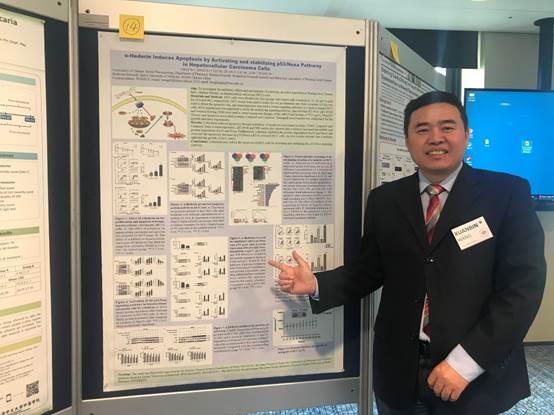 在9月18日的大会主旨报告环节,武当特色中药研究湖北省重点实验室学术委员会常务副主任、上海中医药大学首席教授徐宏喜作为亚洲地区代表作了《药用植物活性成分植物化学分析、生物活性与鉴定》(Phytochemical analysis, bioassays and the identification of druglead compounds from medicinal plants)的报告。他以藤黄属植物活性成分提取、分离、鉴定及其生物活性为例,介绍了本团队数十年的研究成果。武当特色中药研究湖北省重点实验室主任汪选斌教授则在壁报交流中以《α-常春藤皂苷通过激活和稳定p53/Noxa通路诱导肝癌细胞凋亡》(α-Hederin Induces Apoptosis by Activating and stabilizing p53/NoxaPathway in Hepatocellular Carcinoma Cells)为题分享了团队在武当特色中药预知子的抗癌活性研究进展。