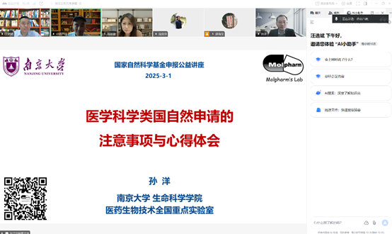 2025年3月1日,《国自然冲刺:基金申报公益讲座 - 促青年人才发展,助中国基础科研》线上报告会成功举办,本次会议受到广大学者的极大关注,该讲座于科研云平台、蔻享学术平台、B站、微博、有道词典、抖音等相关平台累计13298人观看。报告主讲嘉宾:南京大学孙洋教授;会议发起人:中华中医药学会中药实验药理分会名誉主委、上海中医药大学徐宏喜首席教授,中华中医药学会中药实验药理分会副主委、福建中医药大学药学院院长李华教授;主持人:中华中医药学会中药实验药理分会副主委、福建中医药大学药学院院长李华教授;讨论嘉宾:中华中医药学会中药实验药理分会副主委、中国药科大学寇俊萍教授,中华中医药学会中药实验药理分会主委、湖北医药学院武当特色中药研究湖北省重点实验室汪选斌教授,中华中医药学会中药实验药理分会副秘书长、沈阳药科大学陈丽霞教授。这是该活动连续第二年举办。本次活动由Acta Materia Medica杂志、国际药学会、江苏省药理学会抗炎免疫专委会、中国药科大学中药学院、福建中医药大学药学院、湖北省药理学会中药药理专委会、沈阳药科大学无涯创新学院、闽台中药分子生物技术国家地方联合工程研究中心主办,由江苏省中药评价与转化重点实验室、福建省中药学重点实验室、武当特色中药研究湖北省重点实验室、福建中医药大学结构药理学与中药化学生物学研究所、蔻享学术平台协办。
