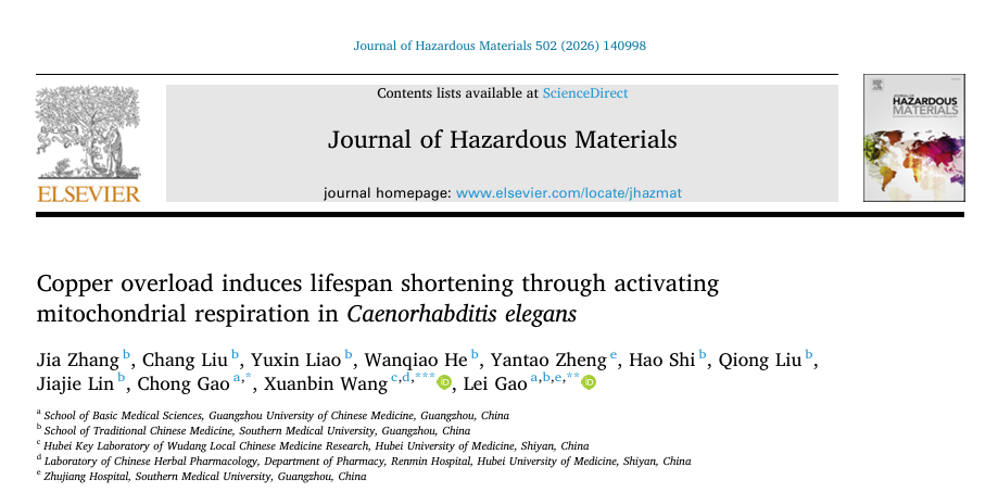 近日,武当特色中药研究湖北省重点实验室汪选斌教授与南方医科大学高磊教授及广州中医药大学高充教授联合在Journal of Hazardous Materials(一区,IF 11.3)期刊上发表题为“Copper overload induces lifespan shortening through activating mitochondrial respiration in Caenorhabditis elegans”的研究论文。团队南方医科大学硕士研究生张佳为第一作者,高磊教授、汪选斌教授和高充教授为并列通讯作者。