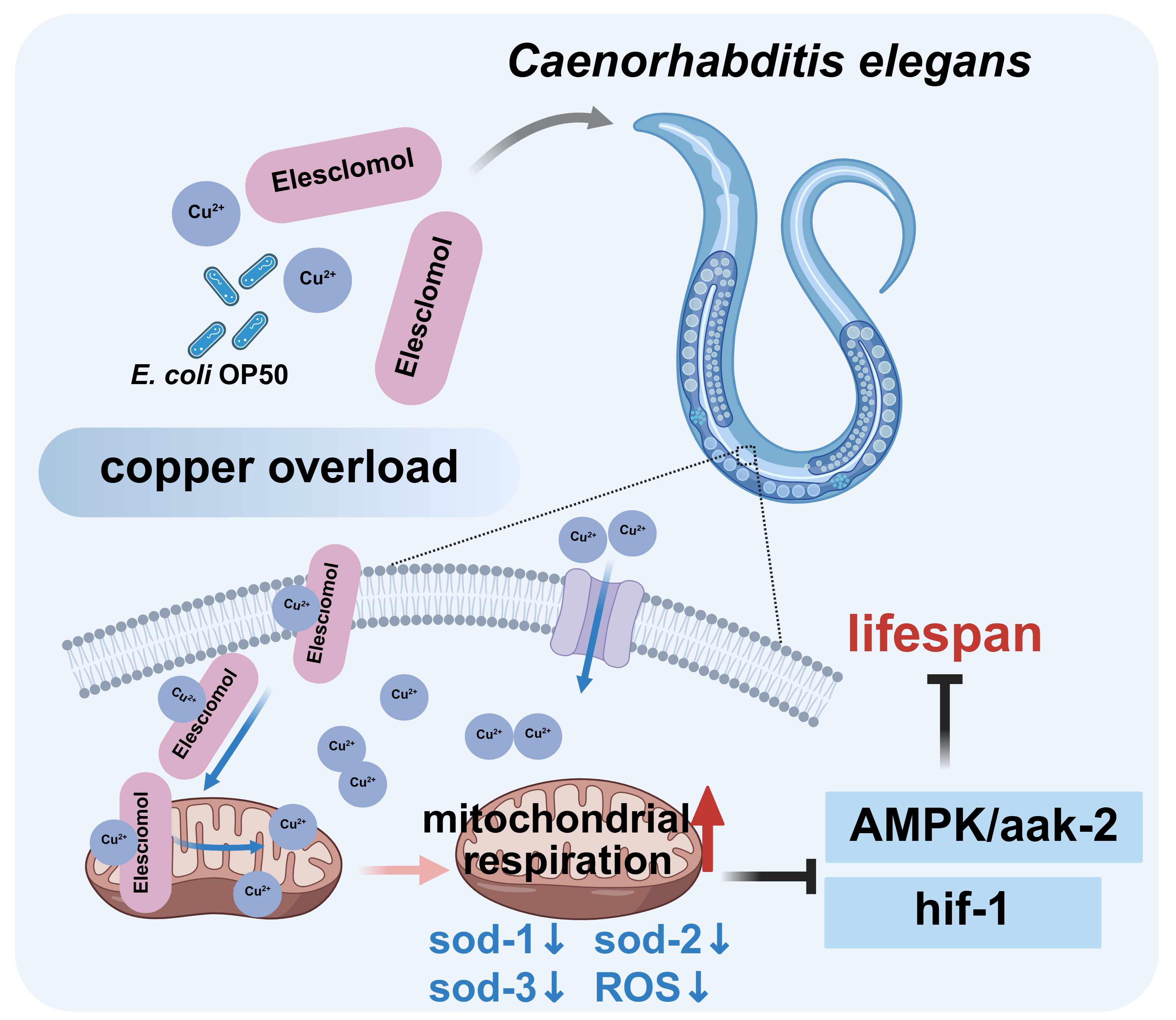 研究通过联合使用CuCl₂与铜离子载体elesclomol(ES)在线虫中建立铜过载模型,并通过检测体内铜离子浓度、铜响应荧光探针信号及铜转运相关基因表达验证模型有效性。通过寿命测定、感染抵抗力检测、线粒体结构与功能分析,系统评估铜过载的生物学效应。进一步利用RNA干扰技术沉默线粒体呼吸链关键基因,并结合突变体株系,探讨铜过载影响寿命的分子通路。铜过载显著缩短线虫寿命及减弱其抗感染能力。铜过载引起线粒体结构损伤与功能紊乱,同时激活线粒体呼吸,表现为氧消耗率上升、ATP合成增加。具体机制为,铜过载通过上调isp-1与mev-1表达增强线粒体呼吸,进而抑制AMPK/aak-2与HIF-1/hif-1的表达。双基因缺失实验进一步证实,aak-2与hif-1协同缺失可加剧寿命缩短与感染抵抗力的下降,提示二者在铜过载介导的衰老过程中具有协同作用。
